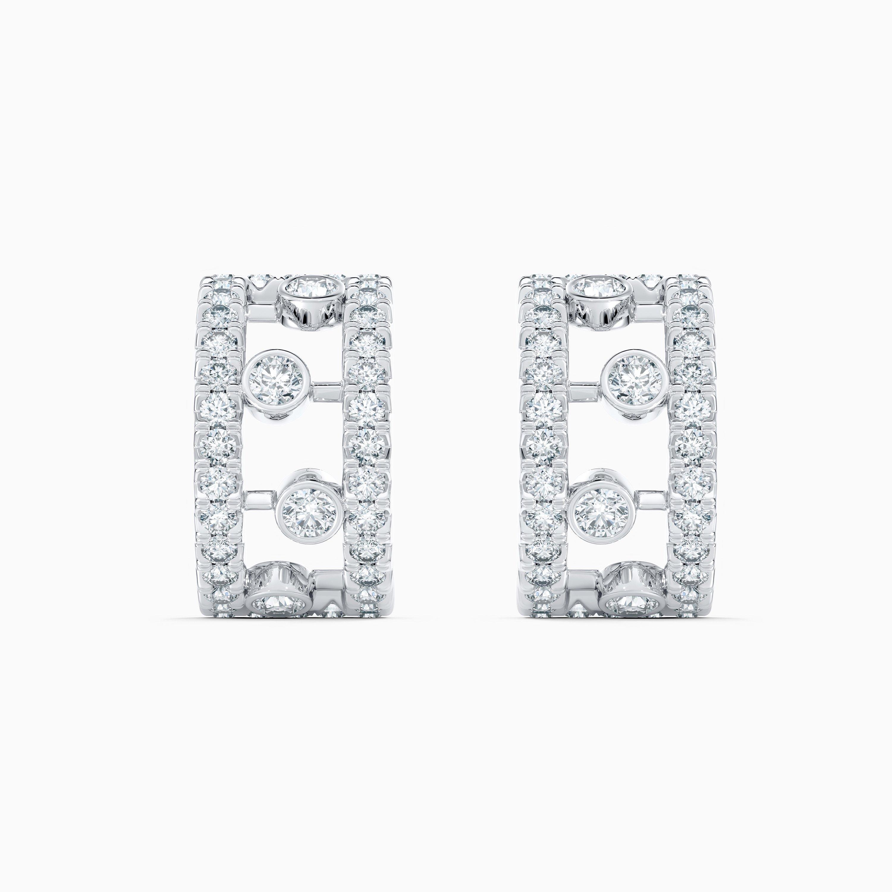 Two delicate lines of meticulously set round brilliant diamonds form the frame of these elegant 18K white gold earrings. Connecting them, larger bezel-set diamonds sit suspended on individual columns of white gold, like dewdrops caught on the petals of flowers at sunrise. This modern arrangement forms a refined hoop earring, generously catching the light. Each of the 80 diamonds in this piece is ethically sourced and selected by eye for its individual Fire, Life and Brilliance. Their combined weight is ~0.68 carats.