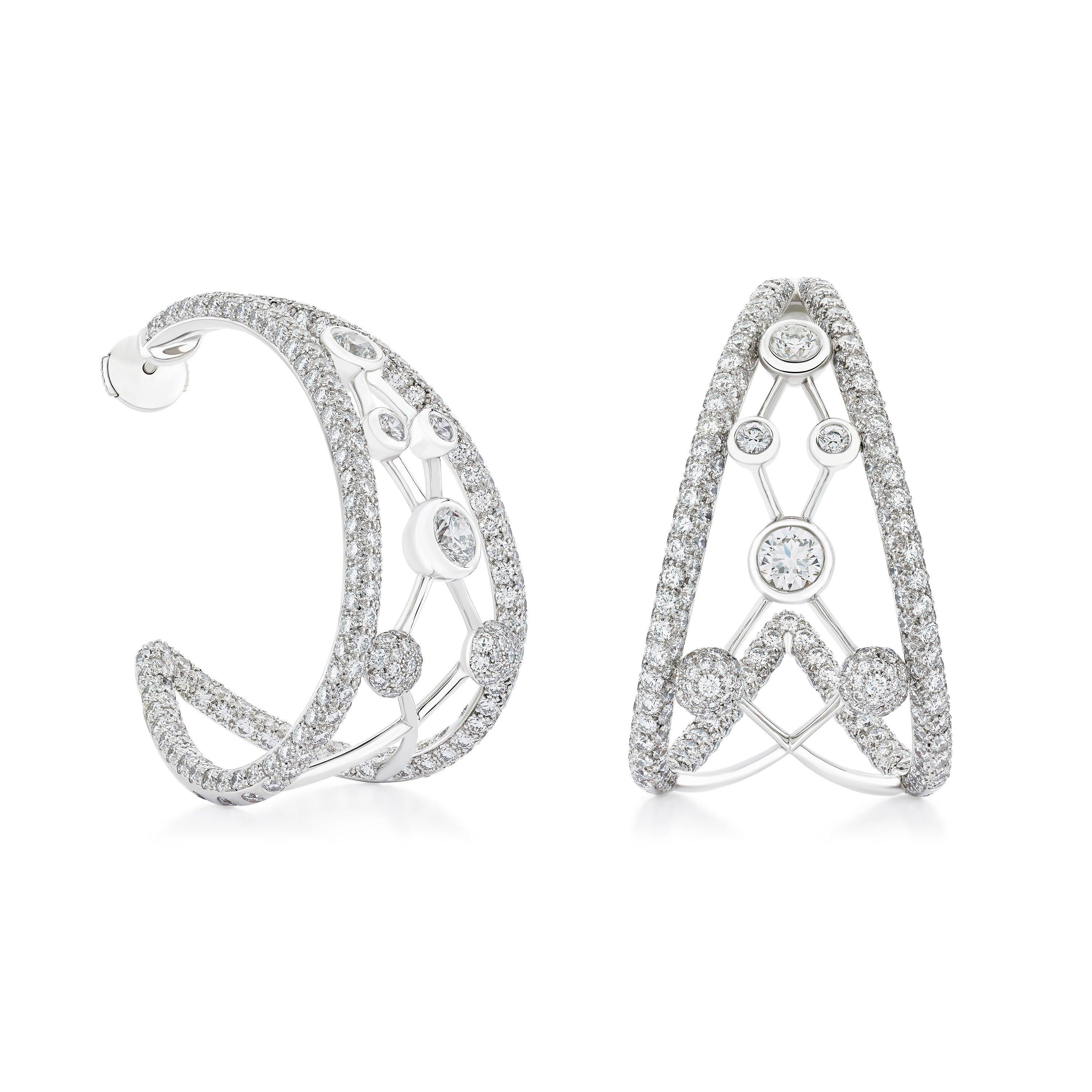 這副獨特的高級珠寶耳環為傳統設計帶來創新詮釋,其靈感來自鑽石結構內的圈環形狀。耳環由兩個密釘鑲鑽圓圈組成,兩個圓圈之間則是由大小漸變的包鑲圓形明亮式鑽石點綴而成的線條,其大膽精緻的設計象徵著原子彼此相互連接的特性。我們運用了極高水平的珠寶工藝技術,方得以栩栩如生地呈現這款複雜而現代感的設計。八顆主鑽和 606 顆密釘鑲鑽石均由 De Beers 以遵循道德章程的方式開採,並依其火光、生命力和亮光透過人手和肉眼逐一精心挑選而出。這副耳環將以最精緻的方式為佩戴者的臉龐增添璀燦光華。