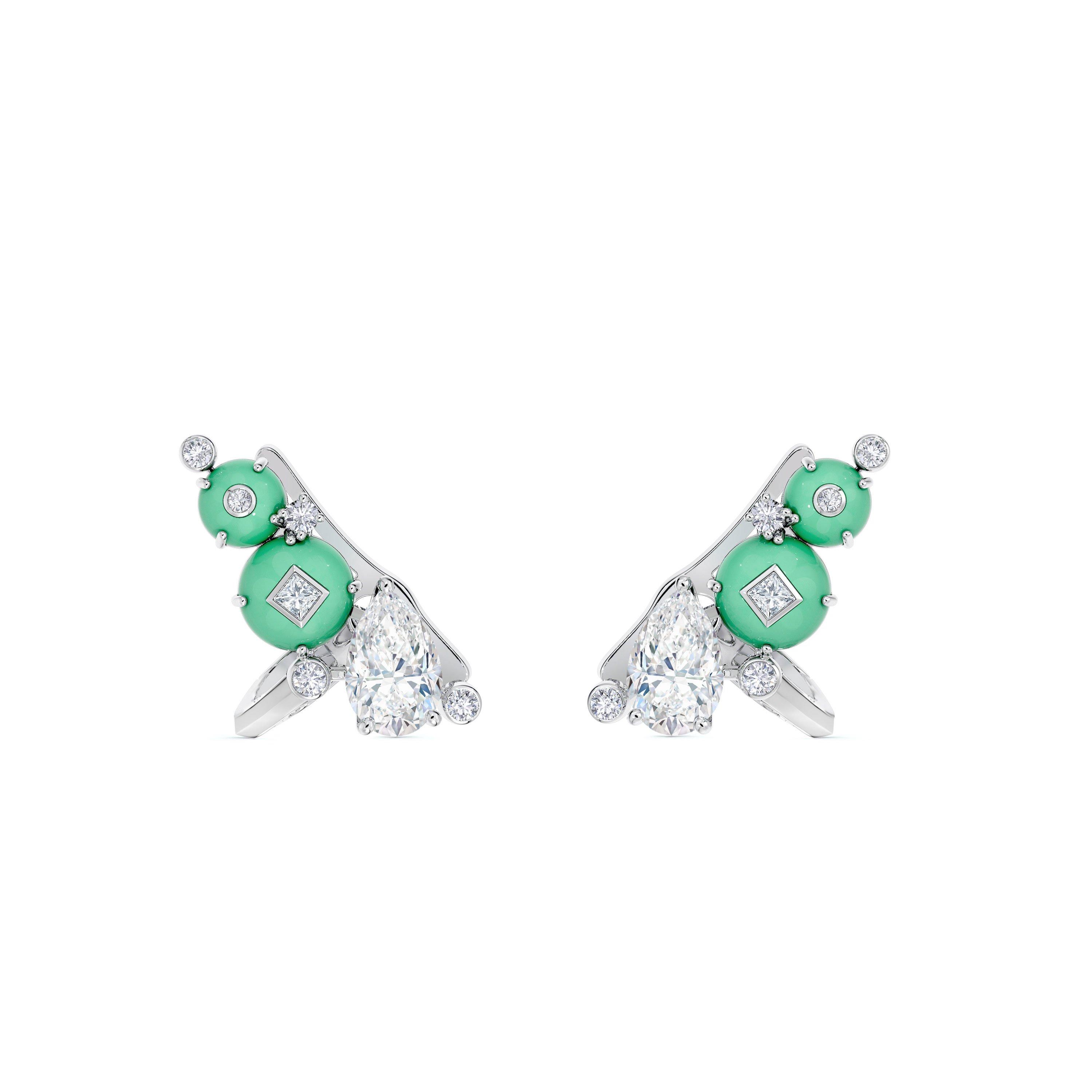 這款18K白金攀緣耳環的靈感來自於夜空中的綠色星塵雲和繁星,其特點是多樣化的鑽石切割和創新的鑲嵌方式,反映了宇宙的相互關聯性。作品的主鑽為兩顆逾1.50克拉的梨形切割白鑽,周圍鑲嵌圓形明亮式和公主方形鑽石,並與兩顆蛋面切割的綠玉髓圖案並列,綠玉髓圖案本身中也鑲嵌著鑽石——這種鑲嵌技術需要令人難以置信的精確度才可完成。De Beers 特別採用來自非洲的綠玉髓,其天然的綠色調呼應著宇宙極光的顏色。